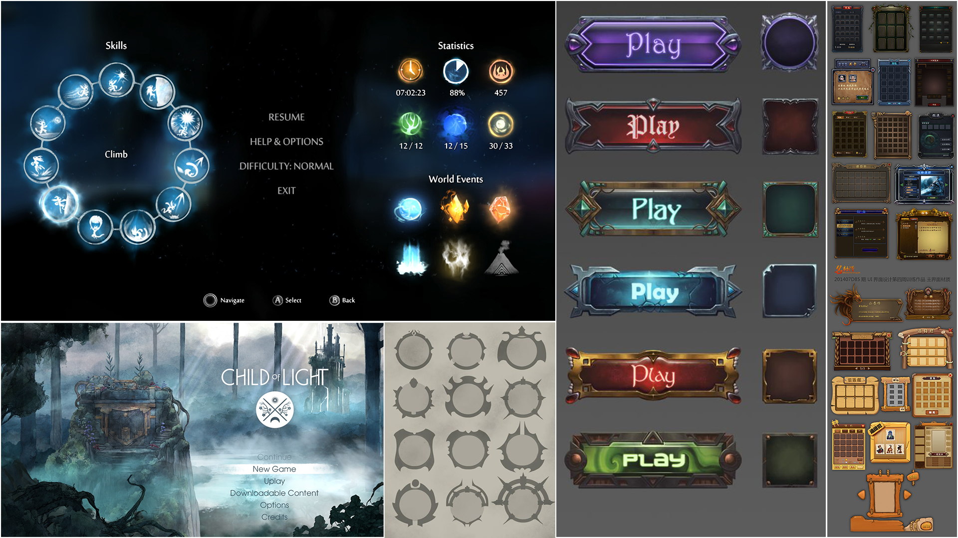 Finding the right visual direction for the UI was one of the more challenging aspects of this project. The low-poly fantasy aesthetic was new territory for me, and the game’s lightweight scope meant the UI had to remain clean and minimal. I gathered many references during early exploration, and Ori and the Blind Forest stood out as a key source of inspiration—especially for its painterly and emotional tone. While I ultimately chose a more raw, sketched visual approach, that reference helped shape my thinking around mood and clarity.