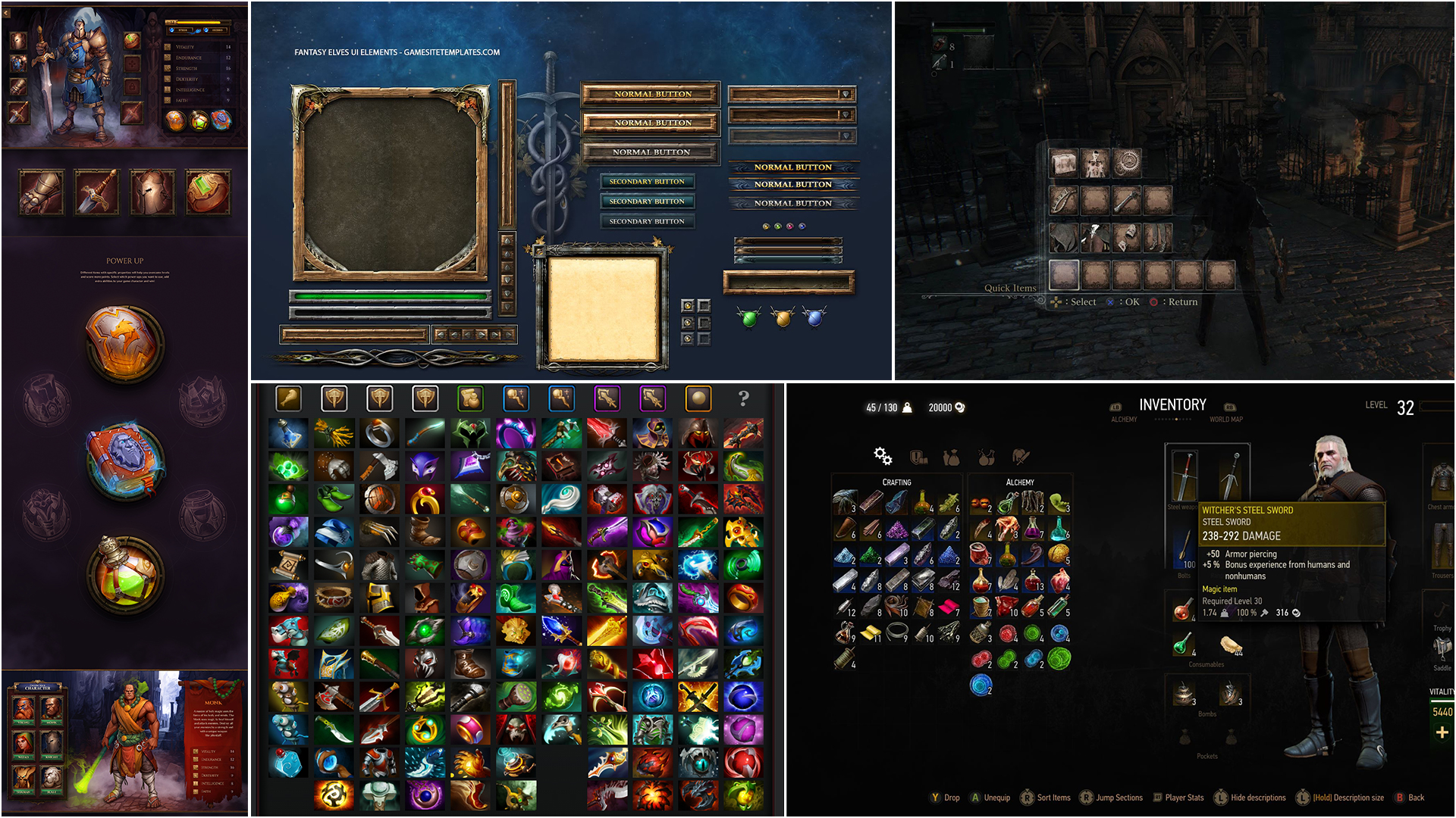 From the beginning, the vision for OMG’s UI leaned into a bold, textured fantasy aesthetic—drawing from genre staples that featured hand-painted details, ornate frames, and dramatic icon shapes. I built a moodboard that focused on high-fantasy UI references with layered materials, giving us a visual benchmark for how complex and immersive the final interface could become.